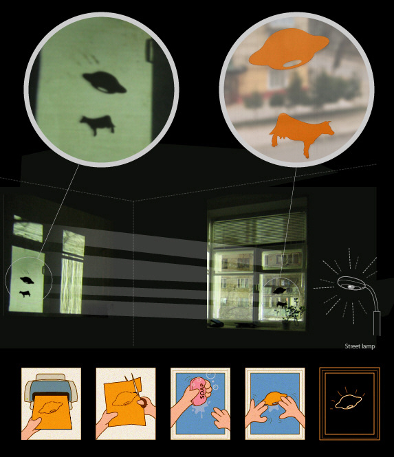 If there is a street lamp behind your window, then the lamp draws a window light contour on your walls. You can use this to create shadow-images. Just put a paper image at the window glass.